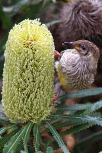 Red wattlebird on banksia aemula (Photo: Pam Rooney)