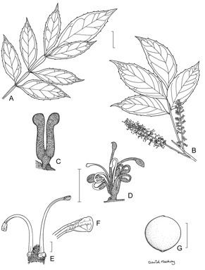 Caption: Gevuina bleasdalei . A , intermediate leaf (J.King 8, BRI); B , shoot with conflorescence; C , flower bud pair; D , flower pair; E , pair of gynoecia with hypogynous glands; F , pollen presenter (B-F , V.Moriarty 807, BRI); G , fruit (Atherton Tableland, Qld, E.Volck, BRI).Illustrators: D.Mackay.